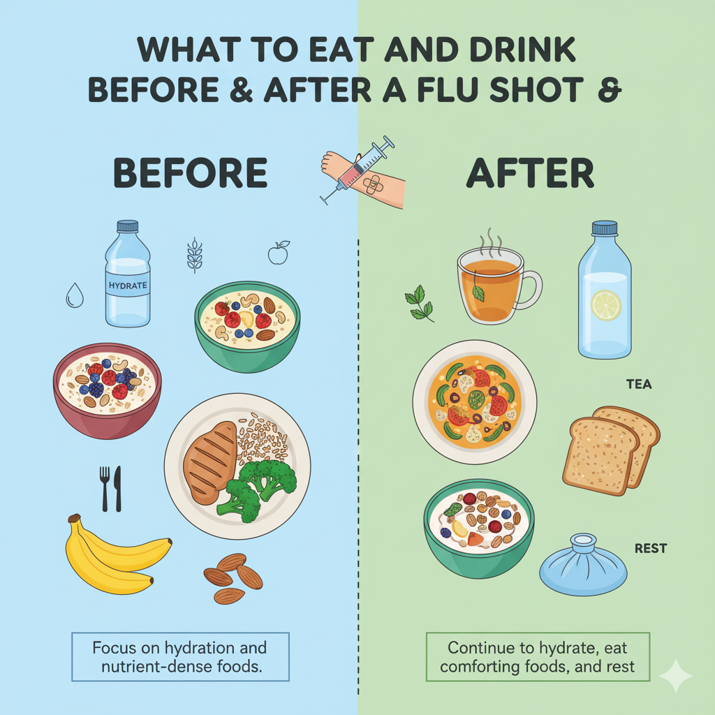 - Before your flu shot: Stay hydrated and eat a light, balanced meal with complex carbs and protein.